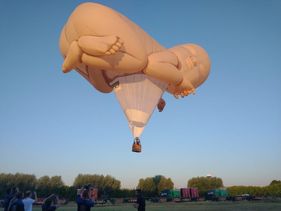 Vanmorgen maakte onze pasgeborene zijn allereerste vaart. De tocht duurde 45 minuten, en verliep vlekkeloos. Deze ballon vormt het thema van een kunstwerk. Dat kunstwerk is 1 heel specifieke vaart die we met de ballon zullen maken in de komende maanden. Het is dus niet de ballon, maar wel die specifieke vaart die het kunstwerk wordt. De Baby werd gebouwd door Cameron Balloons, en is één van de meest complexe special shapes die in de voorbije jaren de fabriek verlaten hebben. Hij is uitgerust met 2 scheurbanen. Binnenin het hoofdje zit er nog een apart membraam, om te grote lift van het hoofd tegenover het lichaam te neutraliseren en om op die manier de duurzaamheid van de ballon te vergroten. Op de vaart van 45 minuten, bij 20 graden, met 2 personen aan boord, bedroeg het verbruik 100 liter-dat is heel bijzonder voor zo’n complexe special shape ballon.