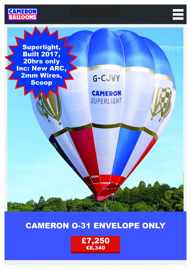 De fabriekshopper (Cameron O-31) van Cameron Balloons is nu te koop. De ballon werd gebouwd in 2017, en heeft slechts 20 uur gevaren. Superlight-stof! De ballon komt met een nieuw ARC, en kan zo ingeschreven worden op zijn nieuwe Belgische eigenaar (op Belgisch adres). De kost voor inschrijving in Engeland bedraagt slechts 73GBP (= 85€)-hier komen geen andere kosten meer bij! Transport van Bristol naar België wordt door ons verzorgd, zonder kosten voor de koper.