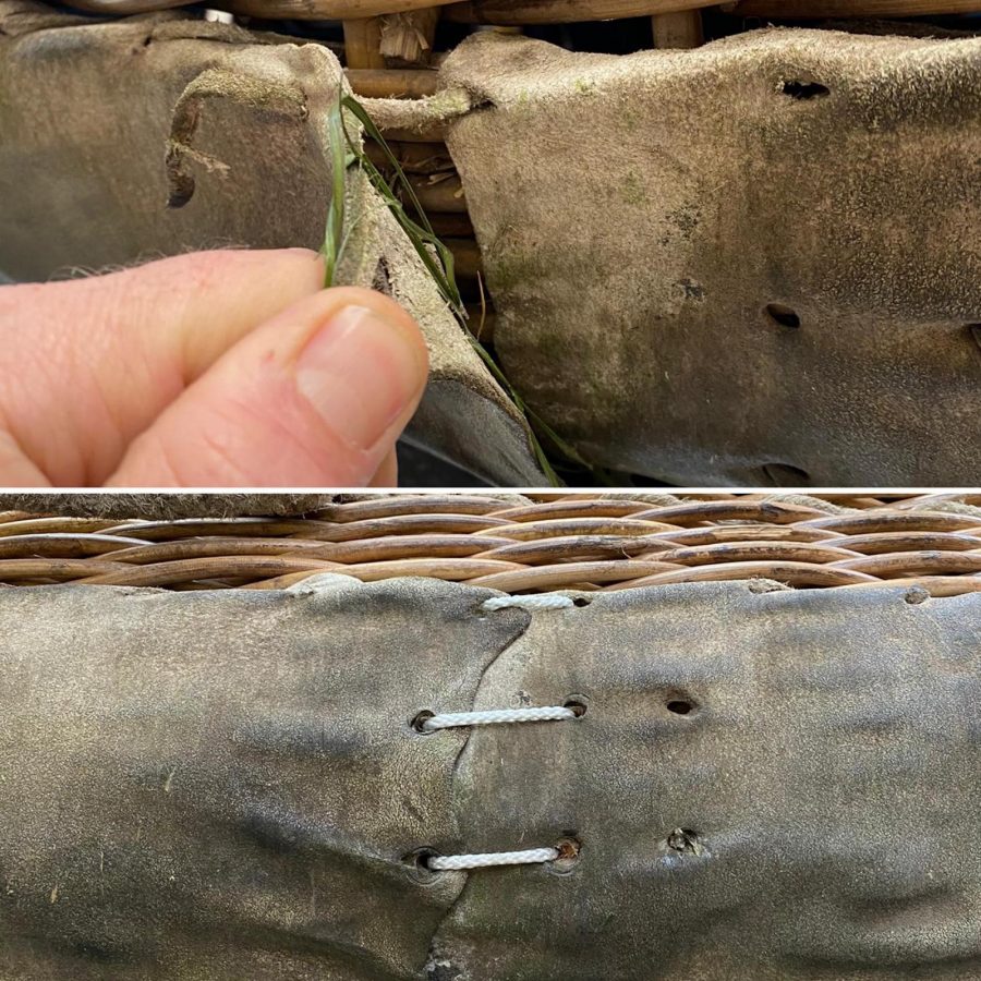 Een stuk bodemleder van deze mand, die gisteren als onderdeel van een complete ballon door ons geïnspecteerd werd, was los. Op dit moment was er geen schade, rot of bovengemiddeld veel opgehoopt vuil in het riet eronder. Door het leder opnieuw vast te maken, voorkom je dat dit in het komende jaar wel gebeurt, en dat je binnen een jaar een misschien onoplosbaar technisch probleem hebt.