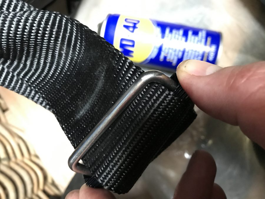 Door niet of weinig gebruikt te worden in de winter, kan het zijn dat de ‘zelfblokkerende’ beugel van je pilootgordel niet meer zo makkelijk over de metalen uiteinden van de gesp schuift. Dan kan het gebeuren dat je de gordel op de juiste lengte trekt, maar dat hij er toch opnieuw een stuk doorheen schuift. Tip: spuit een beetje WD40 (of gelijkaardig product) op de 2 metalen uiteinden waar de beugel over schuift, en beweeg de beugel enkele keren op en neer. Dan zal de gordel opnieuw perfect zijn werk doen.